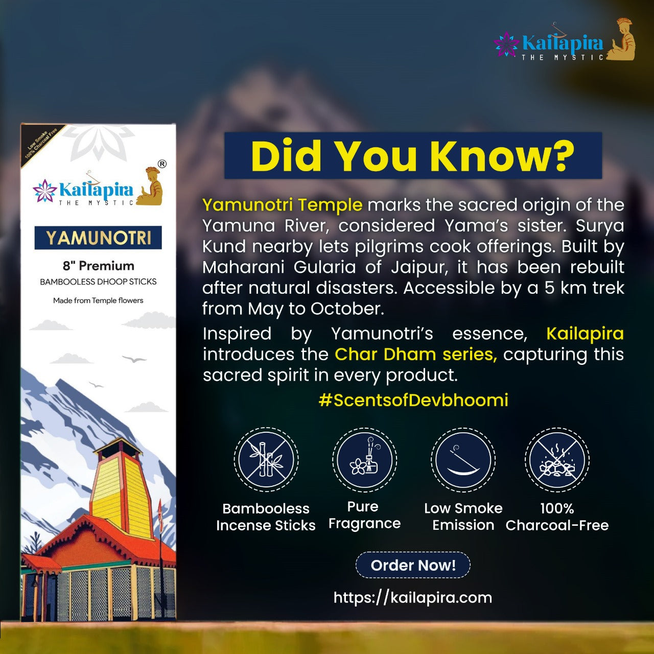 Chaar Dhaam- Yamunotri- Our incense sticks are infused with the holy water from the streams of Yamunotri. Light our Yamunotri Premium Agarbatti and be bestowed with the blessings of Goddess Yamuna. A pack of 40 sticks of our bamboo-less, premium Dhoop Battis infused with the holy water from Yamunotri.